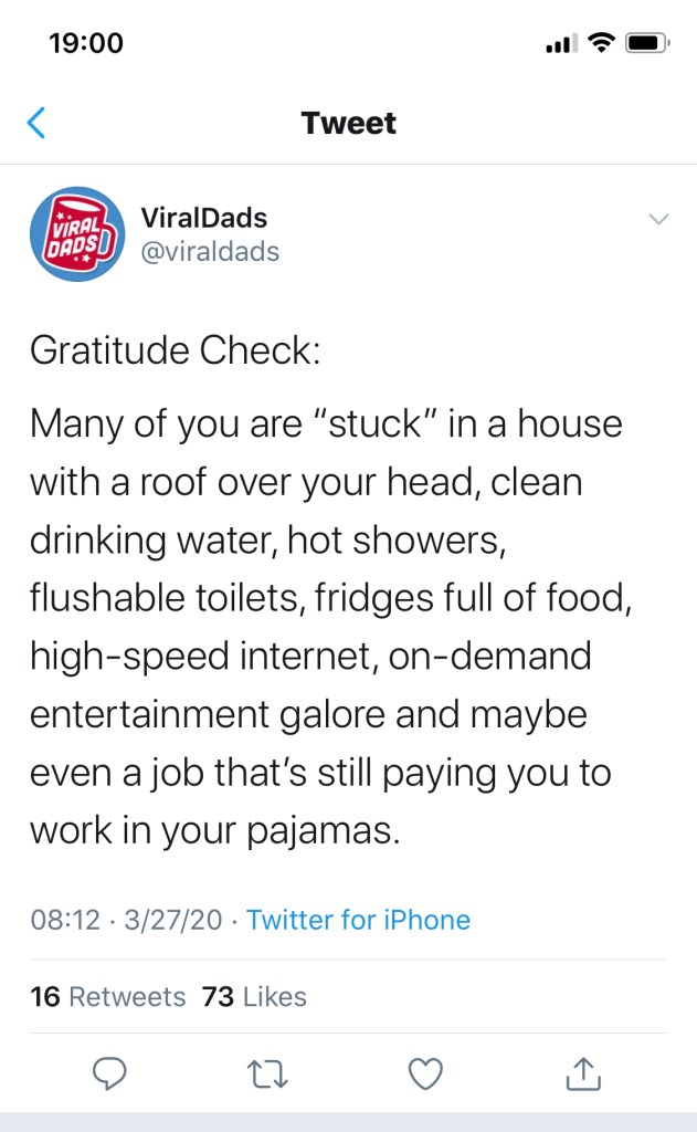 Third, statements like this take into no account the fact that everyone has emotions, regardless of their situation. Are some of us lucky that we’re riding out our quarantine in the relative comfort of our homes with the benefits of technology, well-stocked grocery stores and functional plumbing? Absolutely, no doubt. Does that mean we have no right to be fearful about the state of the world, or concerned about our continued well-being, or sad that we can’t hug our friends, or frustrated with the temporary limitations on our lives? No. We have every right to feel what we feel. Not allowing those emotions to exist, at least initially, can be damaging.