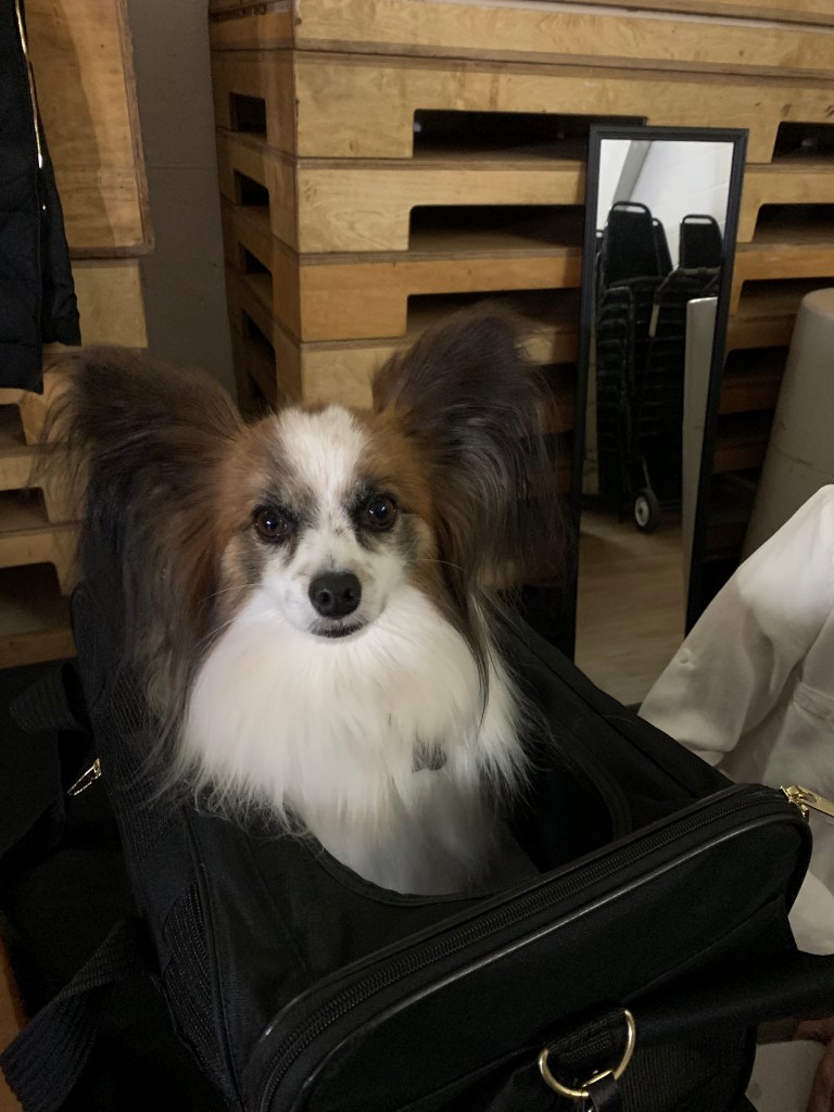 He hangs patiently backstage as I work, lies quietly in his carrier when we go to the gym, greets all of my colleagues like old friends, nudges next to me on the bed after a long day. He’s my four-legged support system. He keeps me balanced.